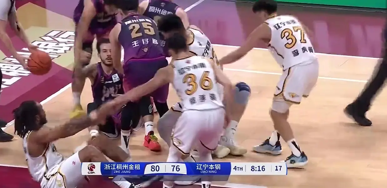 最后一节的比赛,辽宁队背水一战。在第四节比赛打到8分16秒的时候,还出现了一个比较有意思的时候,由于场地多少有些湿滑,辽宁队外援帕顿倒地,结果球被浙江队断下,但他们也没有运好球,结果导致两队有6名球员相继倒地去争球。此等场面,还真是很少见。